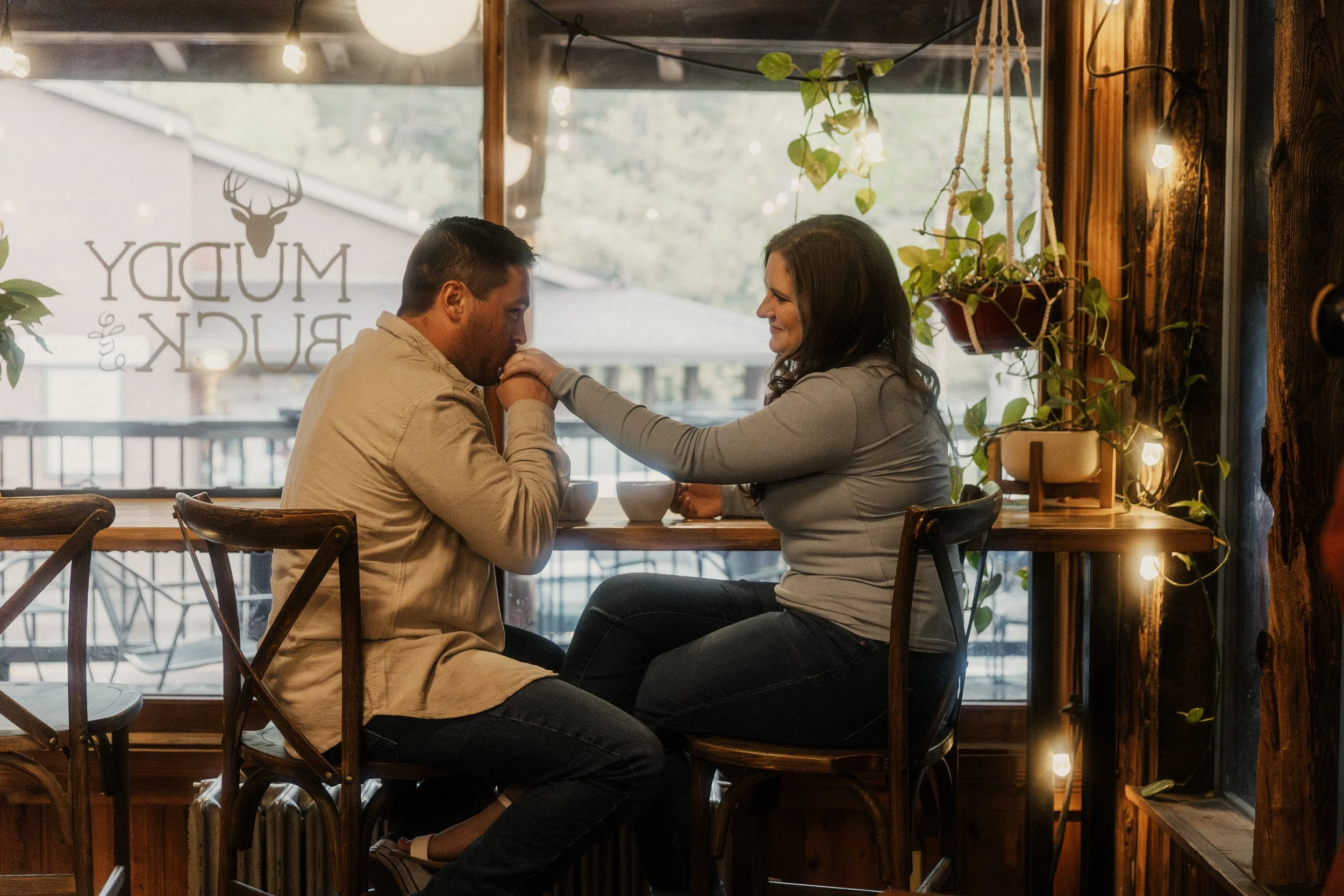 When we first met Natalie and heard her story of how she met her fiancé, it became evident that getting coffee together was one of their favorite things to do. More specifically, Natalie and Riley loved to frequent Muddy Buck Cafe in Evergreen, Colorado. They would play games together, talk, and sip their favorite drinks, sitting in the cozy coffee shop (it looked like the mountain-town version of Central Perk, no kidding). It didn’t take long for Muddy Buck to become a meaningful place for them. And when Riley was ready to pop the question, he and Natalie stopped at Muddy Buck Cafe to buy drinks first. So when it came time to take Natalie and Riley’s engagement pictures, it was a no-brainer to stop at Muddy Buck Cafe first. It was incredibly sweet to document their love in a place that played a large part in their relationship.