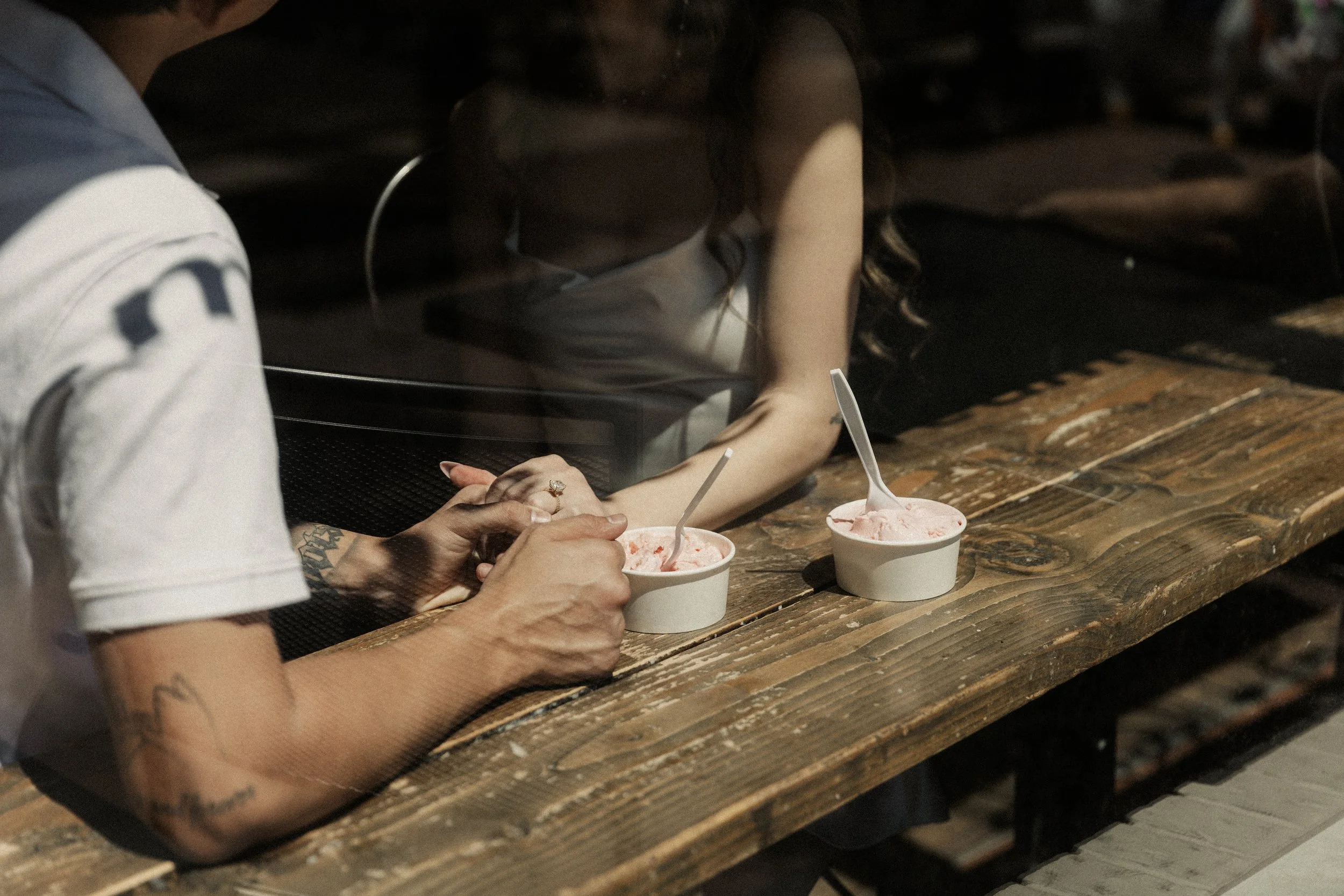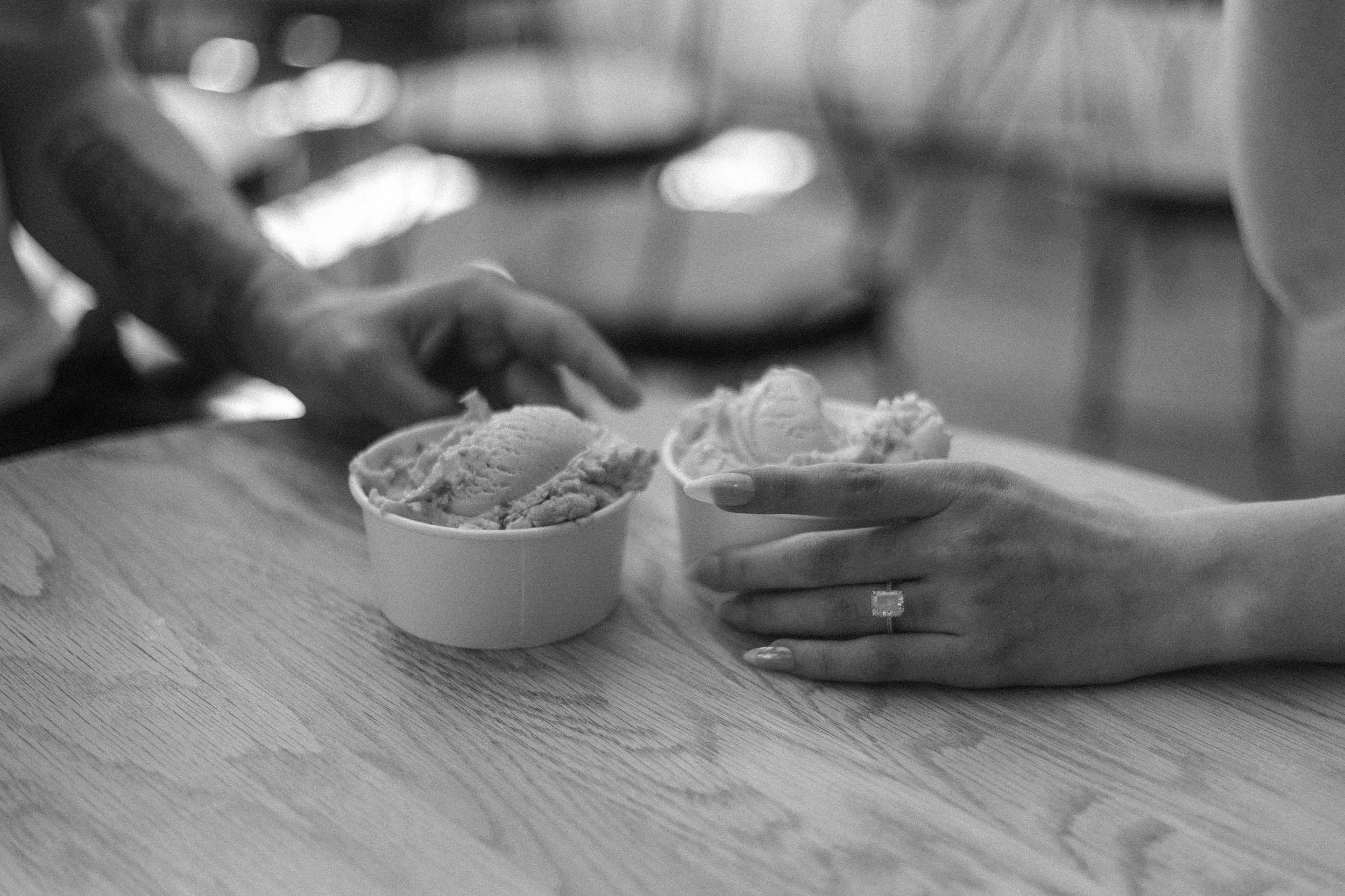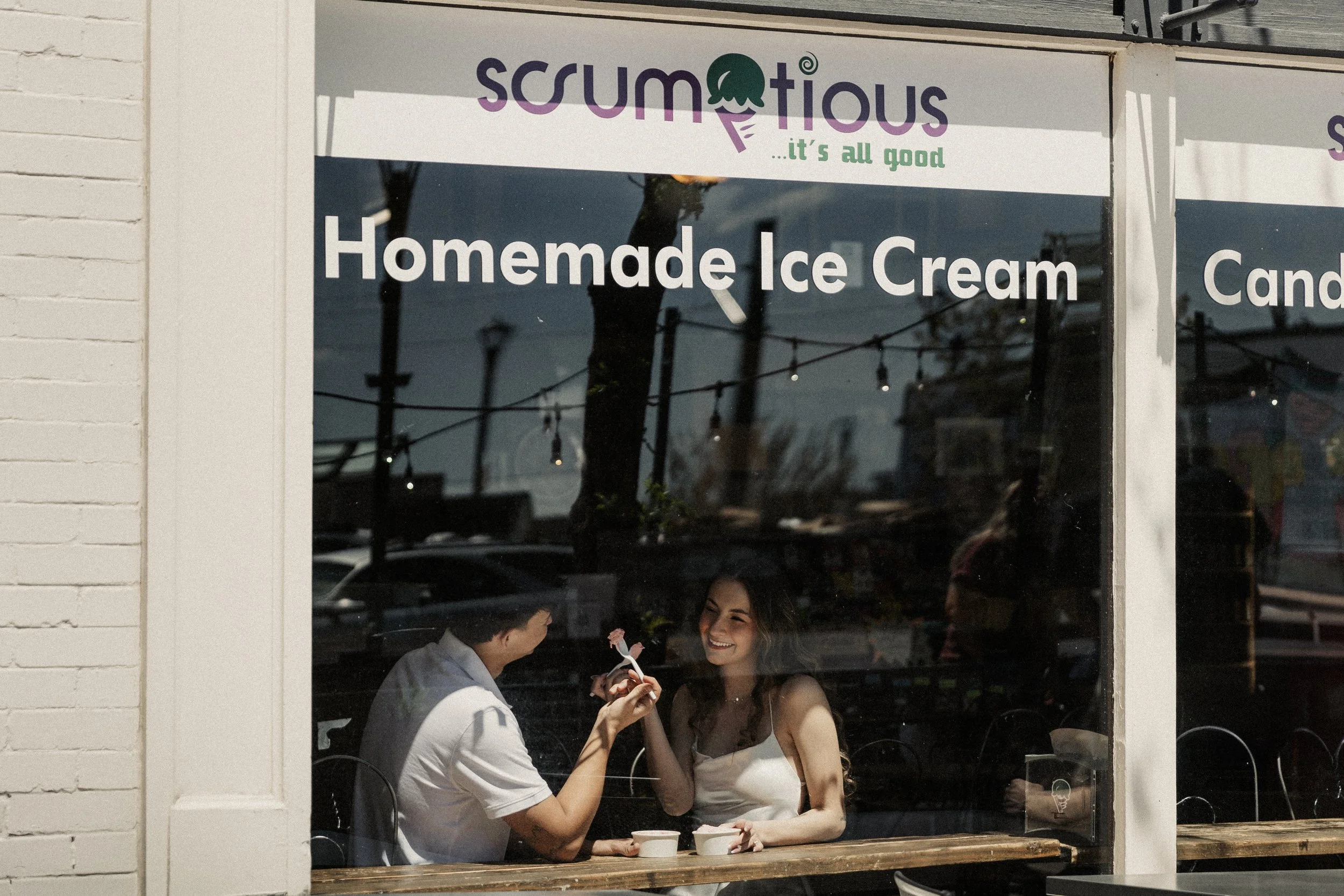 We started this storytelling engagement session inside the ice cream shop itself. The two ordered their favorite ice cream — cotton candy and strawberry — and found a spot to sit, enjoy their ice cream, and just talk. It was so sweet to see these two interact in a place that was important to them; the sentiment elevated their photos and made them that much more authentic.