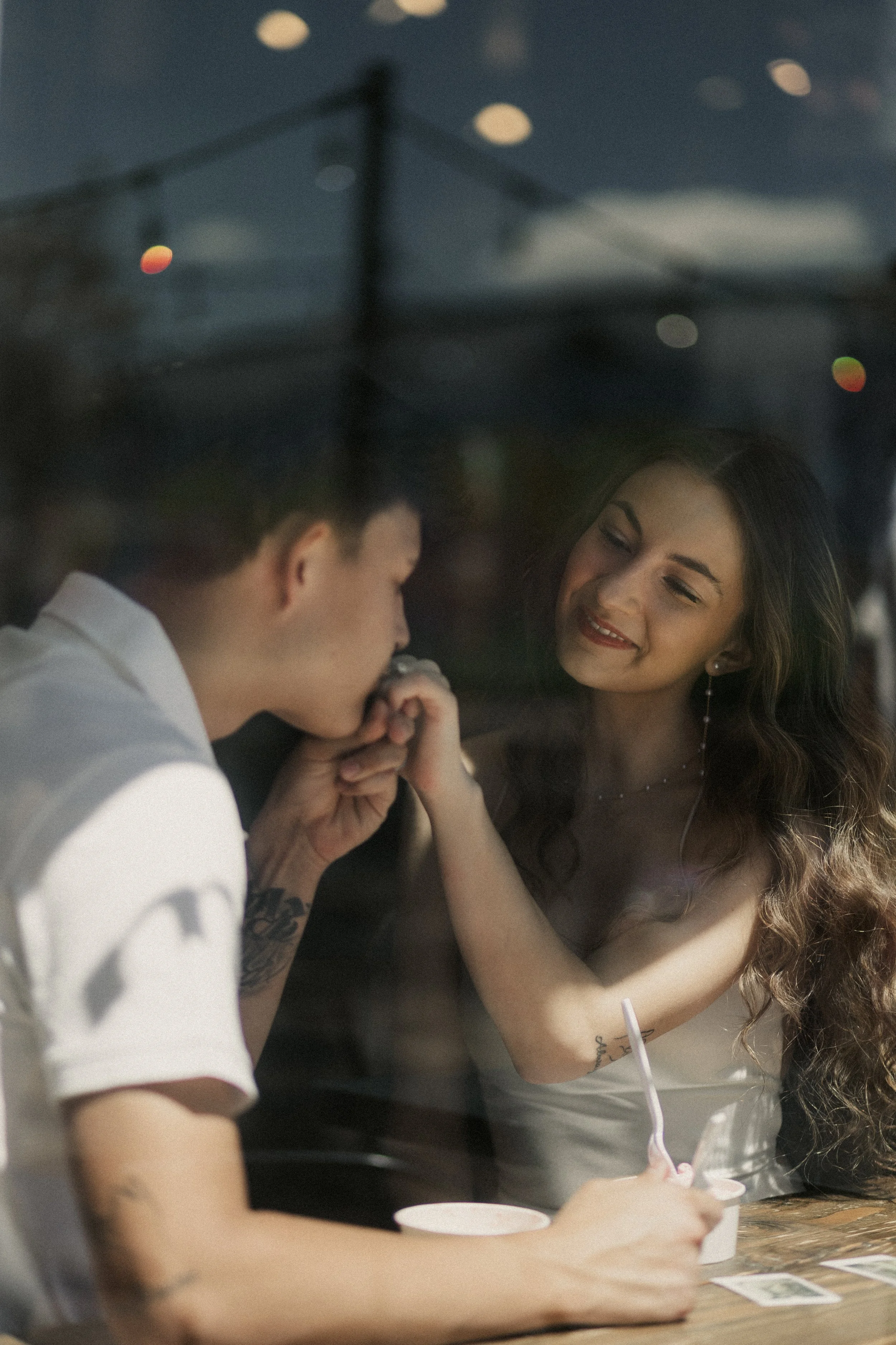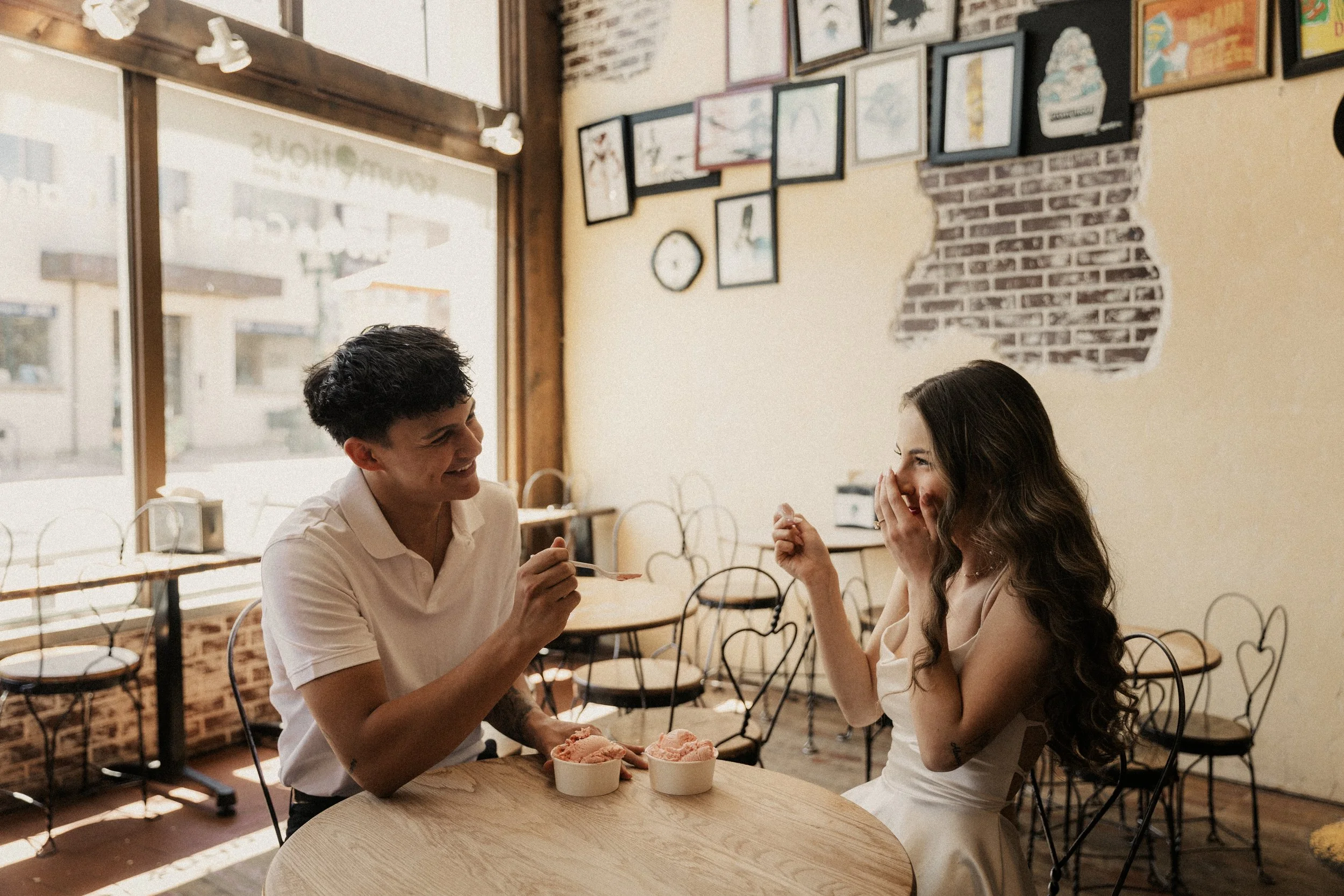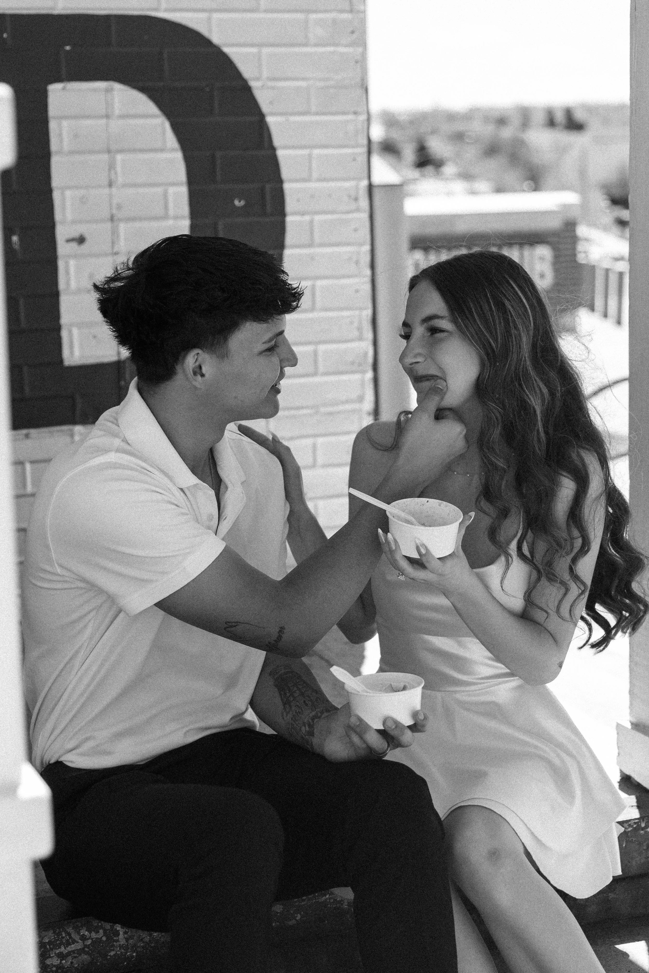 We started this storytelling engagement session inside the ice cream shop itself. The two ordered their favorite ice cream — cotton candy and strawberry — and found a spot to sit, enjoy their ice cream, and just talk. It was so sweet to see these two interact in a place that was important to them; the sentiment elevated their photos and made them that much more authentic.